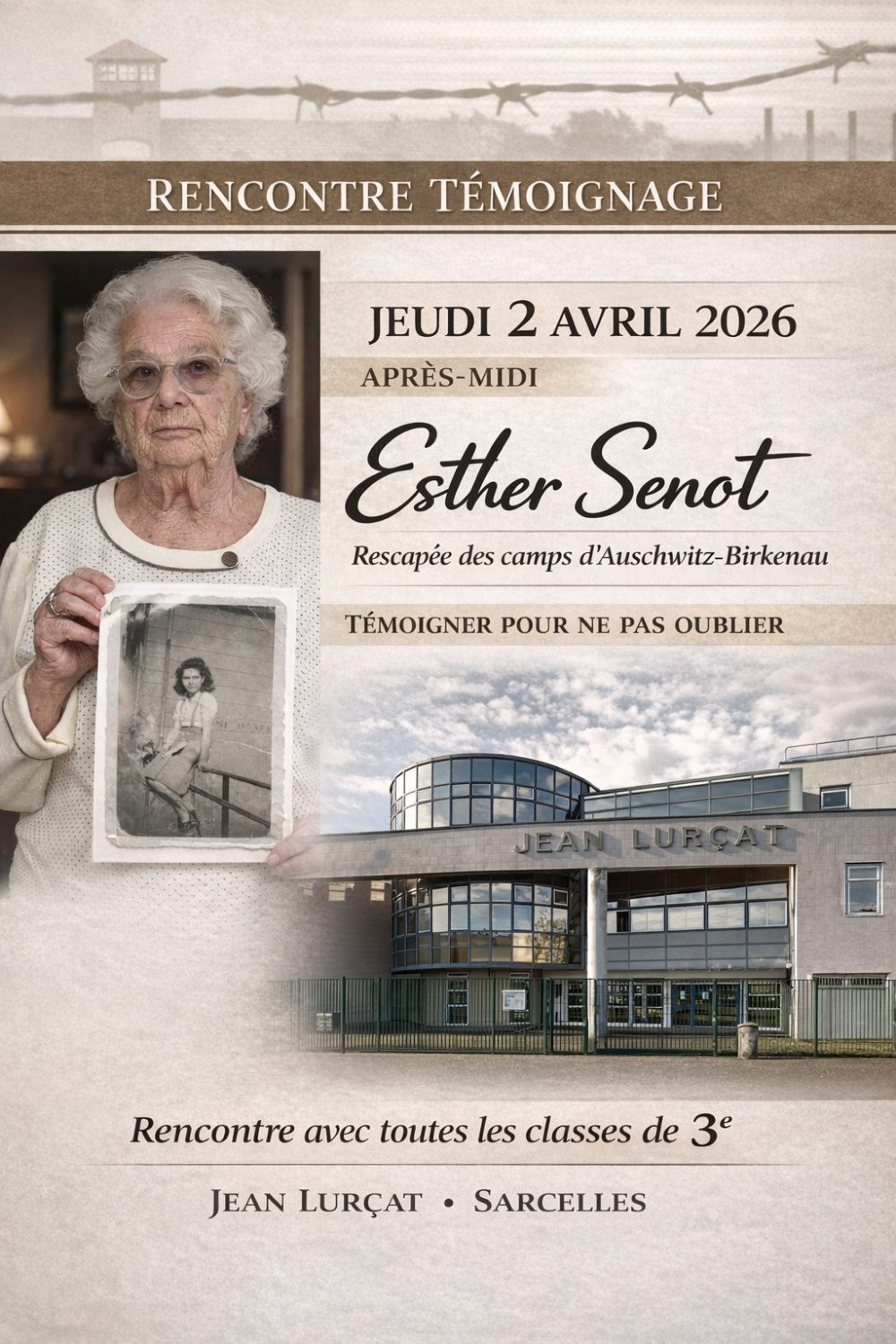 Nous avons l’honneur et le grand privilège d’accueillir au collège Esther Sénot, déportée et rescapée de la Shoah, le jeudi 2 avril 2026.